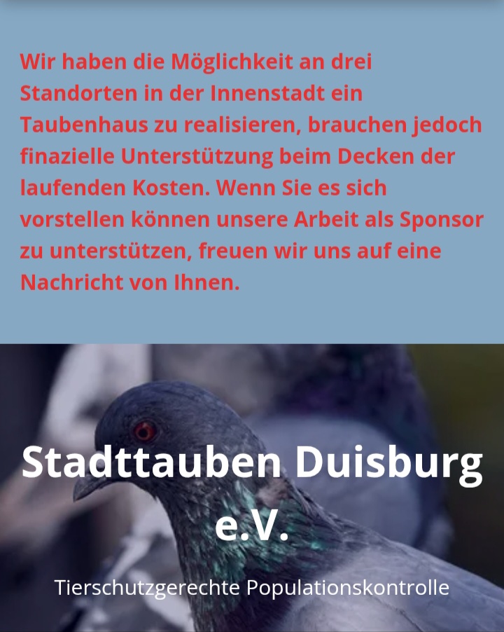 Wie sieht es denn mit der Finanzierung der Taubenhäuser aus, Herr Oberbürgermeister? Es reicht uns nicht in dieser Stadt. „Tauben füttern ist verboten“ Thema beendet.