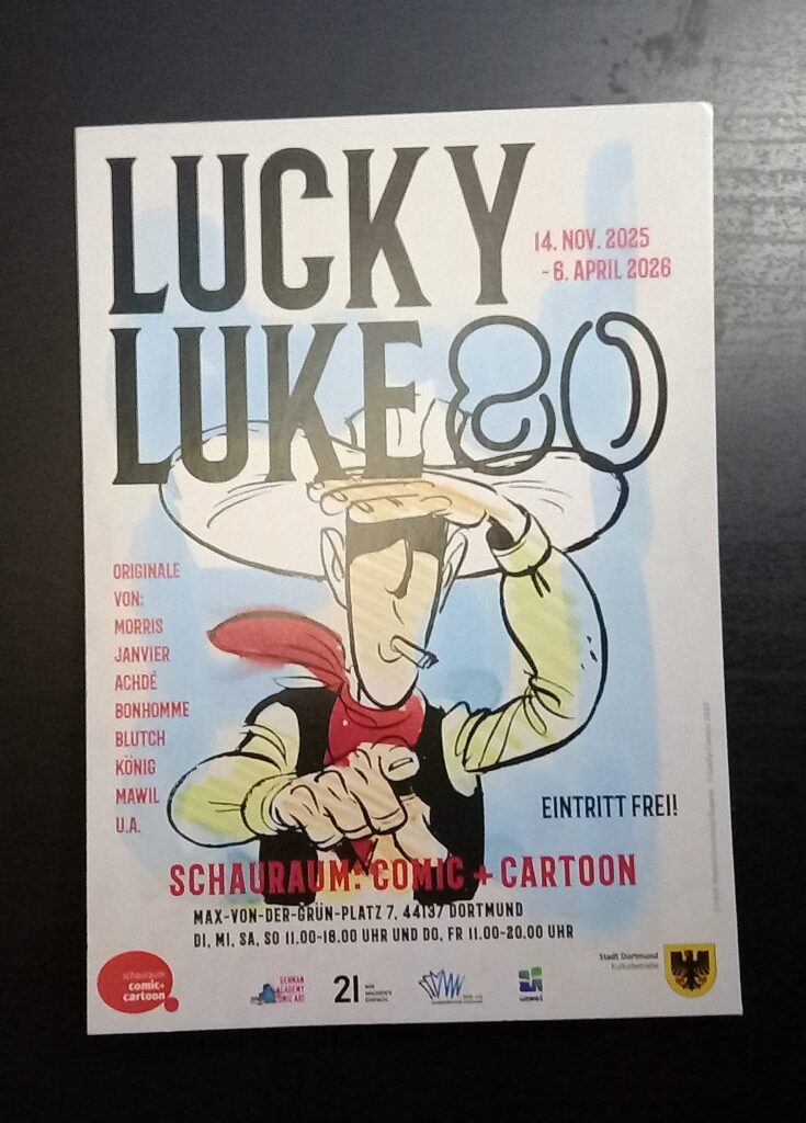 Dieses Jahr wird Lucky Luke 80. Zum Auftakt waren wir im schauraum: comic + cartoon in Dortmund und haben an der Sonntäglichen Führung teilgenommen. Toll! Wir haben einiges über die Belgische Comicszene erfahren, der außer Morris, auch Goscinny, Franquin, Peyo und andere bekannte Zeichner angehören.